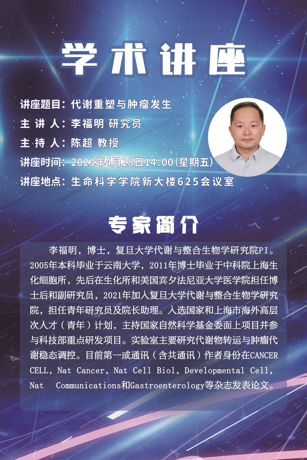 专家简介:李福明,博士,复旦大学代谢与整合生物学研究院PI。2005年本科毕业于云南大学,2011年博士毕业于中科院上海生化细胞所,先后在生化所和美国宾夕法尼亚大学医公司担任博士后和副研究员,2021年加入复旦大学代谢与整合生物学研究院,担任青年研究员及经理助理。入选国家和上海市海外高层次人才(青年)计划,主持国家自然科学基金委面上项目并参与科技部重点研发项目。实验室主要研究代谢物转运与肿瘤代谢稳态调控。目前第一或通讯(含共通讯)作者身份在CANCER CELL,,Nat Cell Biol,Nat Cancer, Developmental Cell,Nat Communications和Gastroenterology等杂志发表论文。